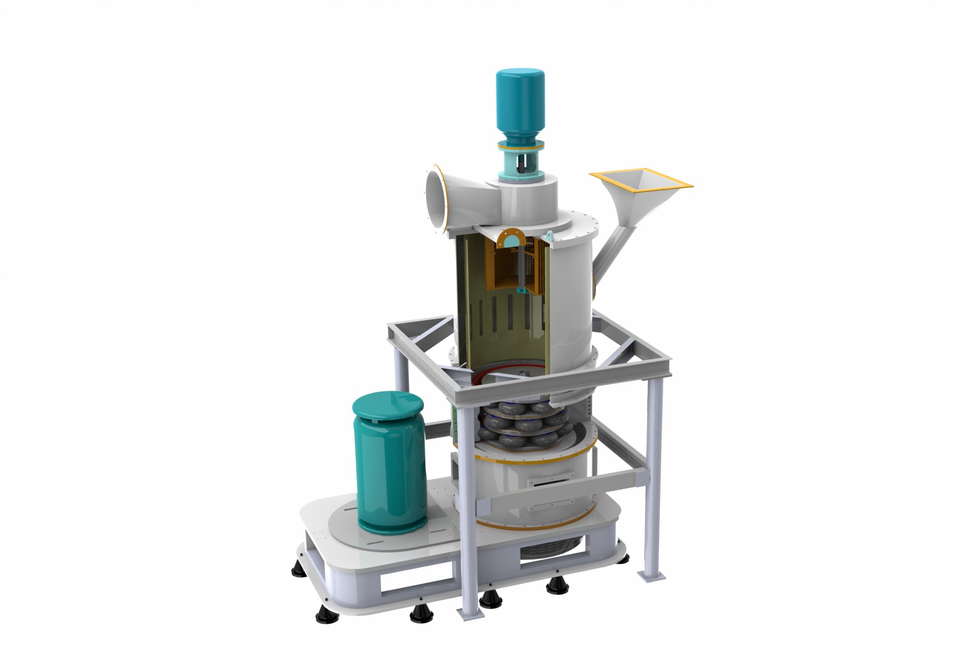 磨腔内无滚动轴承和螺钉,避免了轴承易损、螺钉松动而毁坏设备的问题。采用高效脉冲式除尘器,配置有消音器和消音房,降低了粉尘和噪声污染,环保效果极佳。